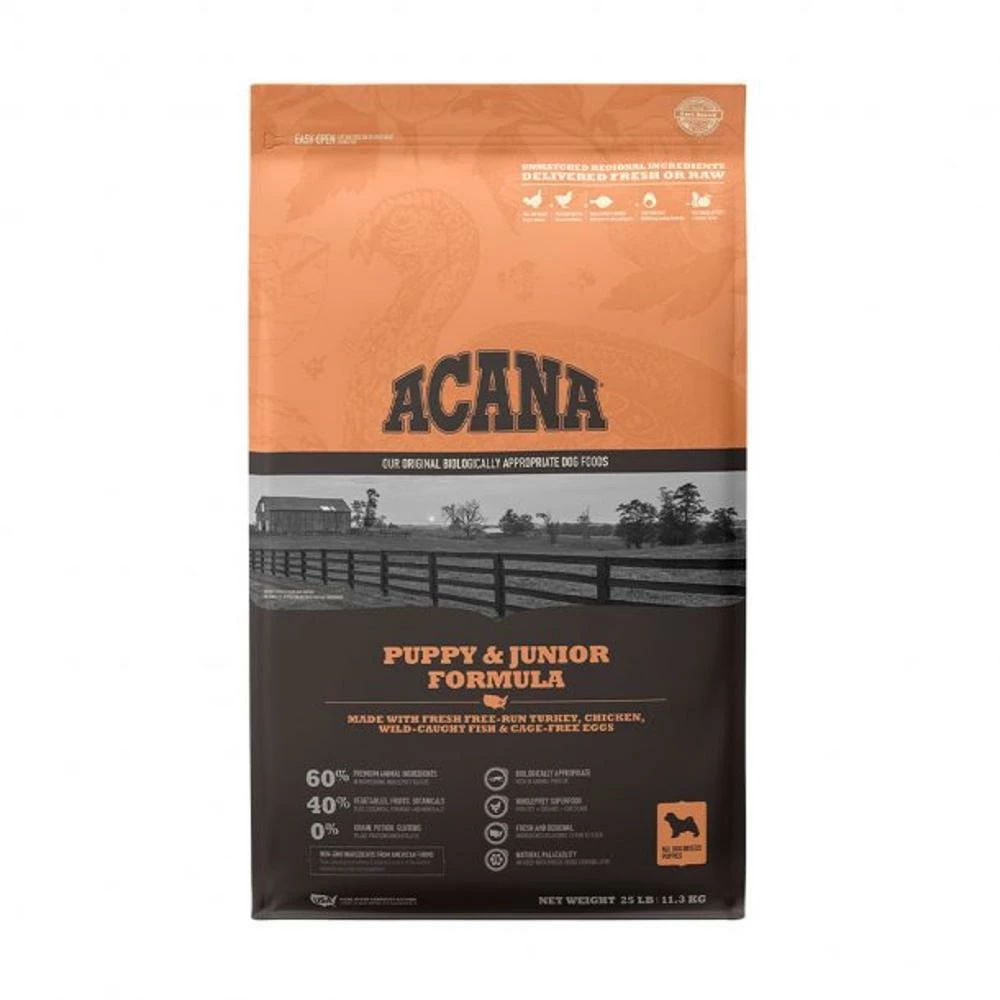 Our ACANA® food for dogs always goes beyond the 1st ingredient&trade, with thoughtfully crafted recipes from start to finish. Your growing puppy needs protein and fat from quality animal protein to support their development. ACANA Puppy & Junior recipe is balanced with 60% quality animal ingredients like free-run chicken and turkey, cage-free eggs, and 40%+ fruits, vegetables, and botanicals like whole pumpkin. Artificial colors, flavors or preservatives are never added in our kitchen. Our premium ingredients come from a curated group of farmers, ranchers and fishers we’ve known and trusted for decades, and we approach every batch with an unsurpassed commitment to safety and quality in our award-winning Kentucky kitchen. The result is a protein-rich, nutritious, and delicious dog food to help them live a healthy, happy life. ACANA Puppy & Junior Recipe is formulated to meet the nutritional levels established by the AAFCO Dog Food Nutrient Pro•les for All Life Stages, including growth of large size dogs (70 lb or more as an adult).