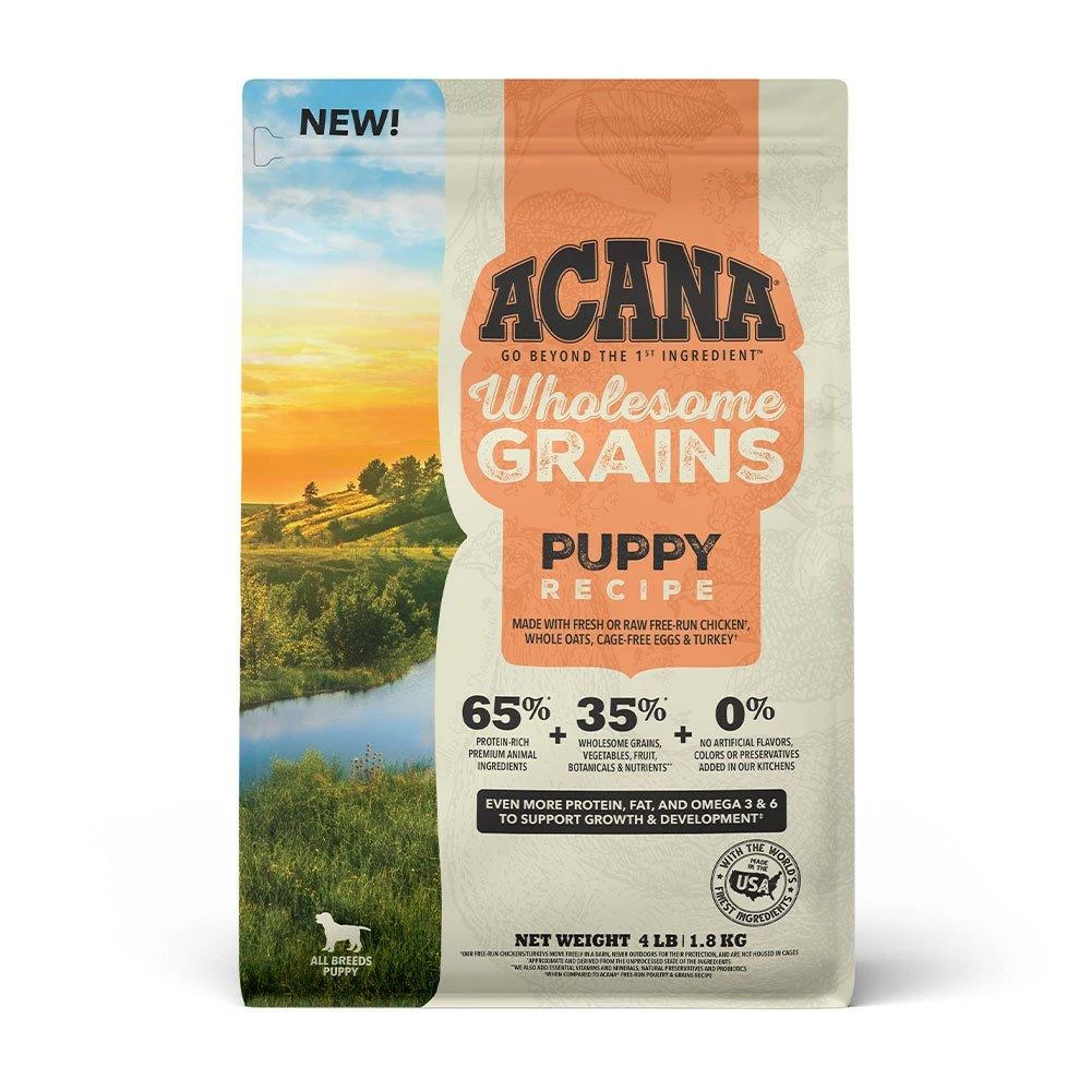 Our ACANA® food for dogs always goes beyond the 1st ingredient, thoughtfully crafted from start to finish. ACANA® Wholesome Grain Puppy recipe is packed with our delicious free-run chicken, cage-free eggs, and free-run turkey, and complemented with wholesome grains like oats, sorghum, and millet. These grains are high in fiber and gluten-free, offering added nutrition that helps support a healthy digestive environment. Plus, our Wholesome Grains Puppy recipe includes even more protein, fat, and Omega-3’s to support your puppy’s growth and development. Our premium ingredients come from a curated group of farmers, ranchers and fishers we’ve known and trusted for decades, and we approach every batch with an unsurpassed commitment to safety and quality in our award-winning Kentucky kitchen. The result is a protein-rich, nutritious, and delicious dog food to help them stay happy and healthy. ACANA WHOLESOME GRAINS PUPPY is formulated to meet the nutritional levels established by the AAFCO Dog Food Nutrient Profiles for All Life Stages – including growth of large breed dogs (70lbs or more as an adult).
