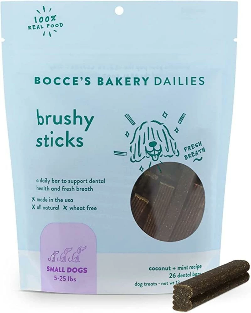 Every Brushy Stick dental bar is made with limited and simple ingredients like: nutty coconut and crisp mint to support your doggy’s overall dental health and extra fresh breath. (Don’t worry – no artificial &lsquoflavorings’ or fillers here.) Oh, and bristle-shaped for extra cleaning, too! Brushy Sticks dental bars are available in 3 sizes – for the safest treat time, it’s important to choose the right size dental bar based on your pup’s weight.