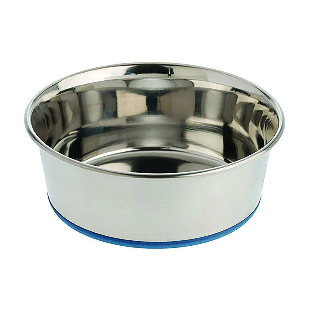 OurPets bowls are made of high-quality, heavy-duty stainless steel with a permanently-molded rubber ring on the base of the bowl that prevents sliding and noise. They are dishwasher-safe and scratch-resistant.