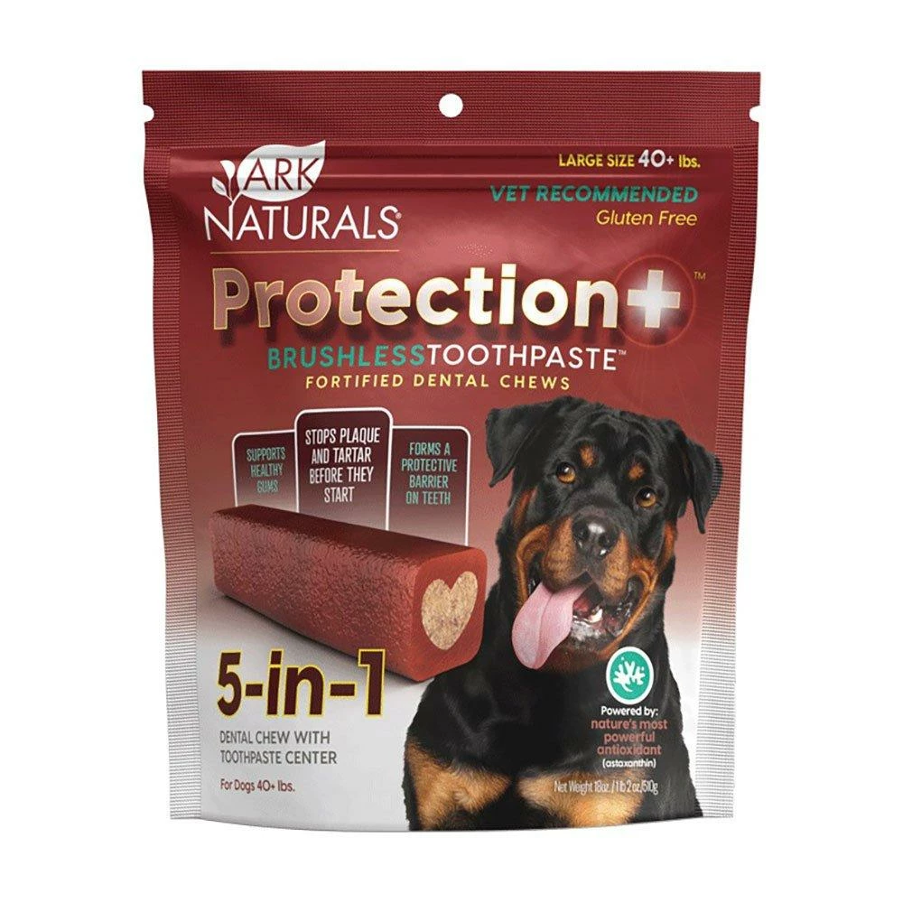 Protection+&trade Brushless Toothpaste is the only dental chew that stops plaque and tartar before they start! Powered by nature’s most powerful antioxidant: Astaxanthin! Astaxanthin stops plaque and tartar before it can even start by boosting the antibody immunoglobulin A (lgA) in the saliva, therefore creating a protective barrier on teeth! Our unique 5-in-1 dental chews have a toothpaste center with active ingredients and natural breath fresheners such as cinnamon, clove and vanilla. Our dental chews also support gums with antioxidant power and form a protective barrier to support healthy teeth.