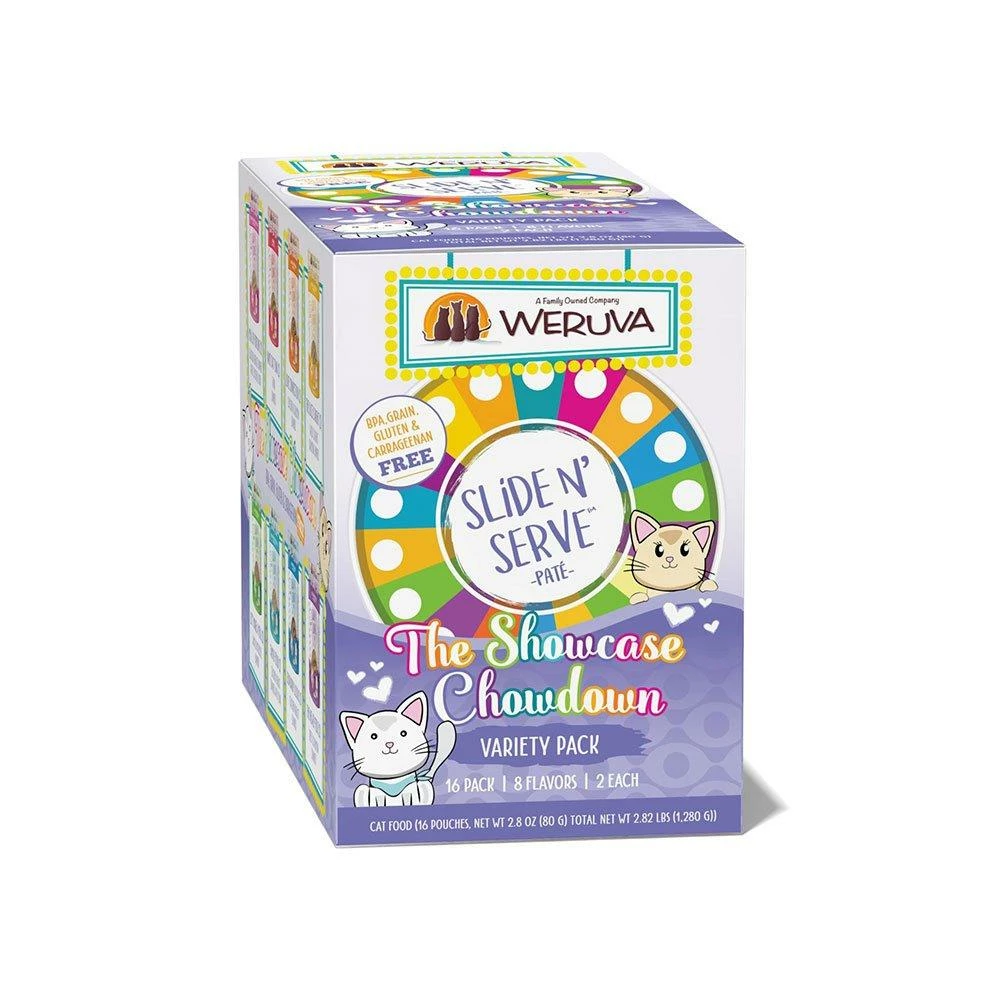 - The Showcase Chowdown Slide N’ Serve Variety Pack (2.8oz pouch, Pack of 16) Spin the wheel and choose from 8 exciting flavors! Featuring cage-free chicken, wild-caught salmon, tuna, grass-fed beef or lamb gently pureed into a creamy and delicious pate. Convenient Slide N’ Serve pouch makes meal time fun and easy!